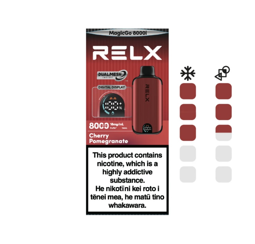 The RELX MagicGo 8000i Cherry Pomegranate is an advanced disposable vape that redefines the vaping experience. Imported directly from RELX Vape New Zealand, it combines innovative technology with a sleek, metallic design to deliver exceptional performance and style.