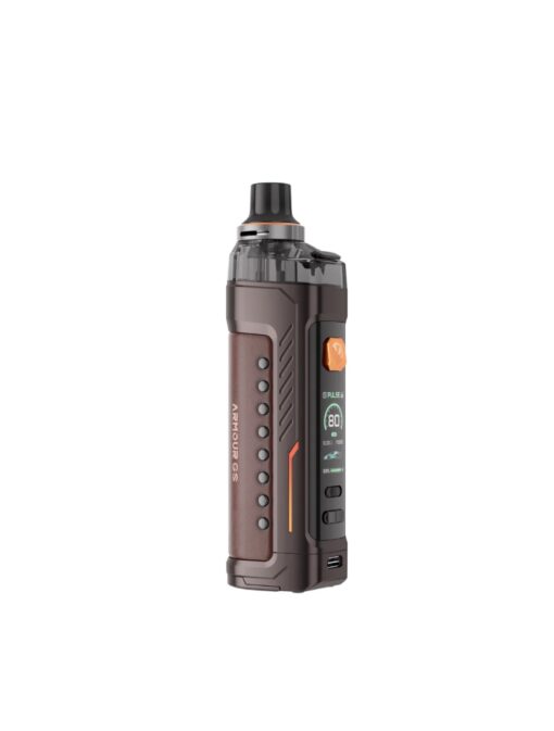 The Vaporesso Armour G vape kit boasts an elegant design with its stylish leather casing, providing a sophisticated look while ensuring a comfortable grip.