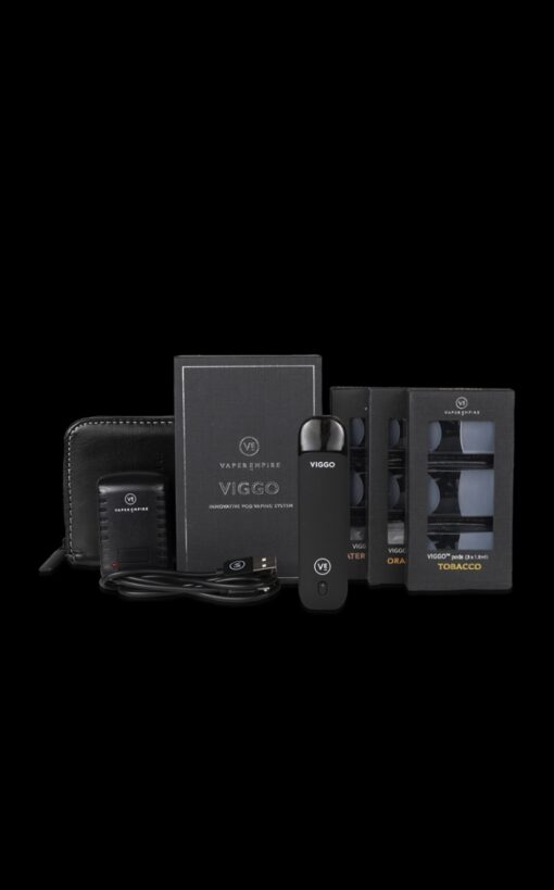 Vape starter kits typically come with everything a vaper needs to get started. This generally includes a vaping device, vape liquid (e-juice), and a charger for the vape battery. With the VIGGO Series deluxe starter kit, customers receive the VIGGO Pod Vaping Device, three packs of VIGGO Vape Pods, a USB charging cable, USB wall adapter, and a classic leather-bound pouch for storing your devices and pods. With the VIGGO deluxe kit, everything you need to vape with pods is included.
